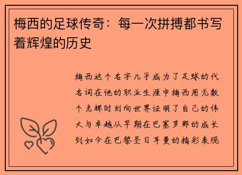 梅西,这个名字几乎已成为足球世界的代名词。他不仅是一位伟大的球员,更是无数球迷心中的传奇。作为阿根廷足球的象征,梅西自从踏上职业球场的那一刻起,就肩负着为国争光的使命。然而,在长期的国际赛事生涯中,梅西一直缺少一项重要的荣誉——世界杯冠军。这个梦想,几乎成为了他职业生涯的一个遗憾,尽管他在俱乐部和个...